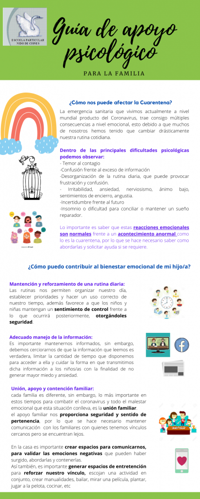 El aislamiento preventivo y obligatorio por la pandemia de Covid-19 ha transformado la vida de muchas familias, así como las rutinas y el día a día. Es por ello que la psicóloga de nuestra escuela, Cristina Ulloa, ha entregado una serie de pautas y recopilado información relevante para que los estudiantes y sus familias puedan trabajar desde sus hogares.