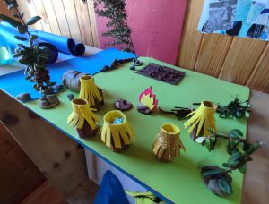 La unidad en la que están trabajando se llama “La hominización y las primeras civilizaciones”, y los materiales utilizados fueron cartón piedra, plastilina, cartulina, palitos de helado, cilindros de confort, plantas reales y piedras. También estaba la opción de hacer un trabajo digital en PowerPoint.
