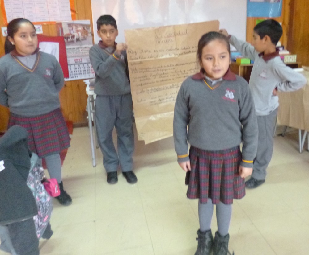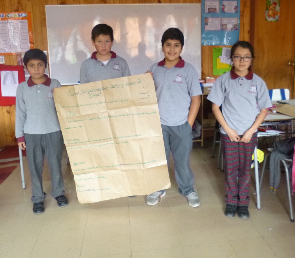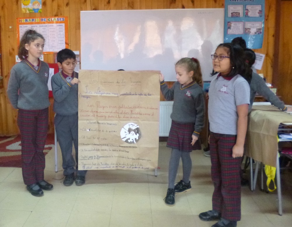 Conocer las características de la civilización Maya, fue el objetivo de una actividad práctica realizada en el 4° básico de nuestra escuela en la asignatura de Historia, en la unidad “Las culturas precolombinas y sus legados”. El objetivo de este trabajo fue aprender las características de esta cultura, para posteriormente presentar una exposición, apoyados por papelógrafos, con toda la información conocida en la unidad.