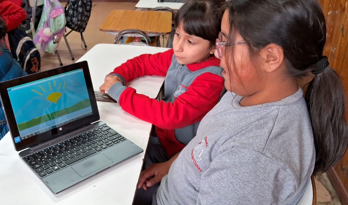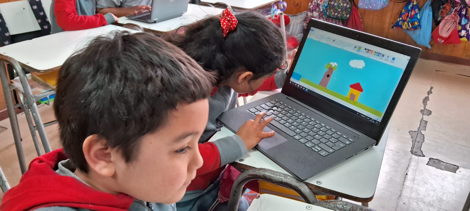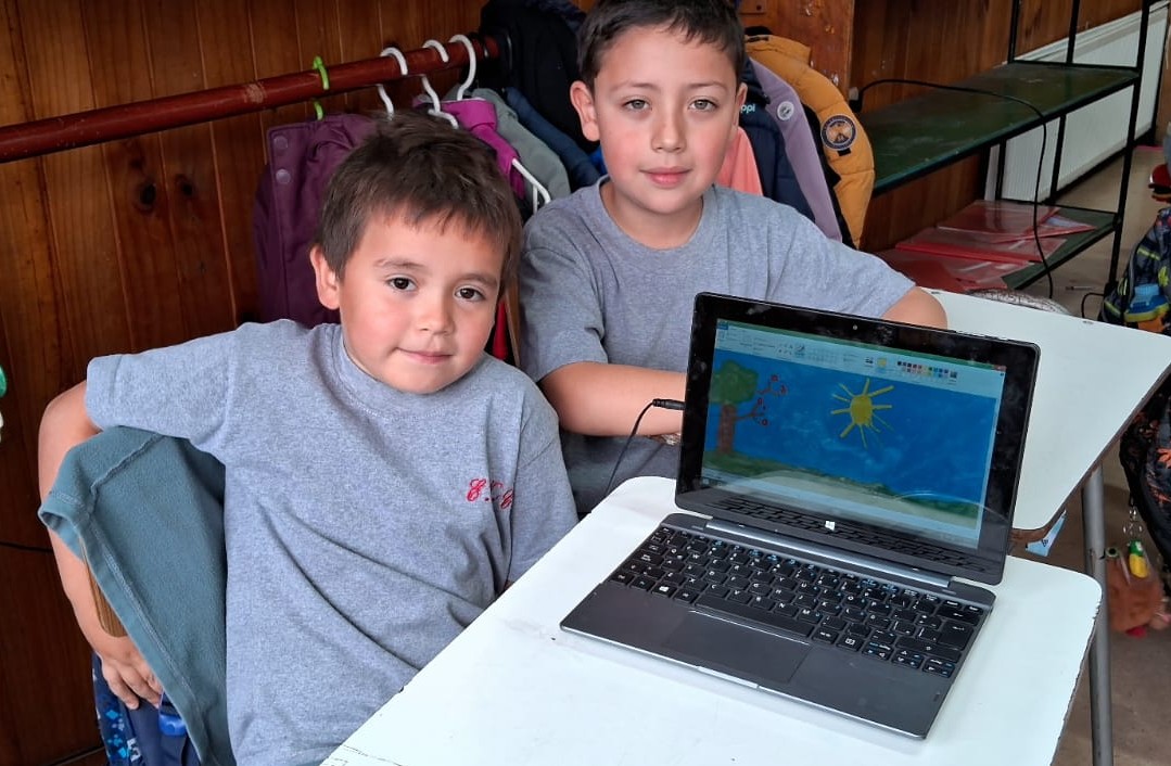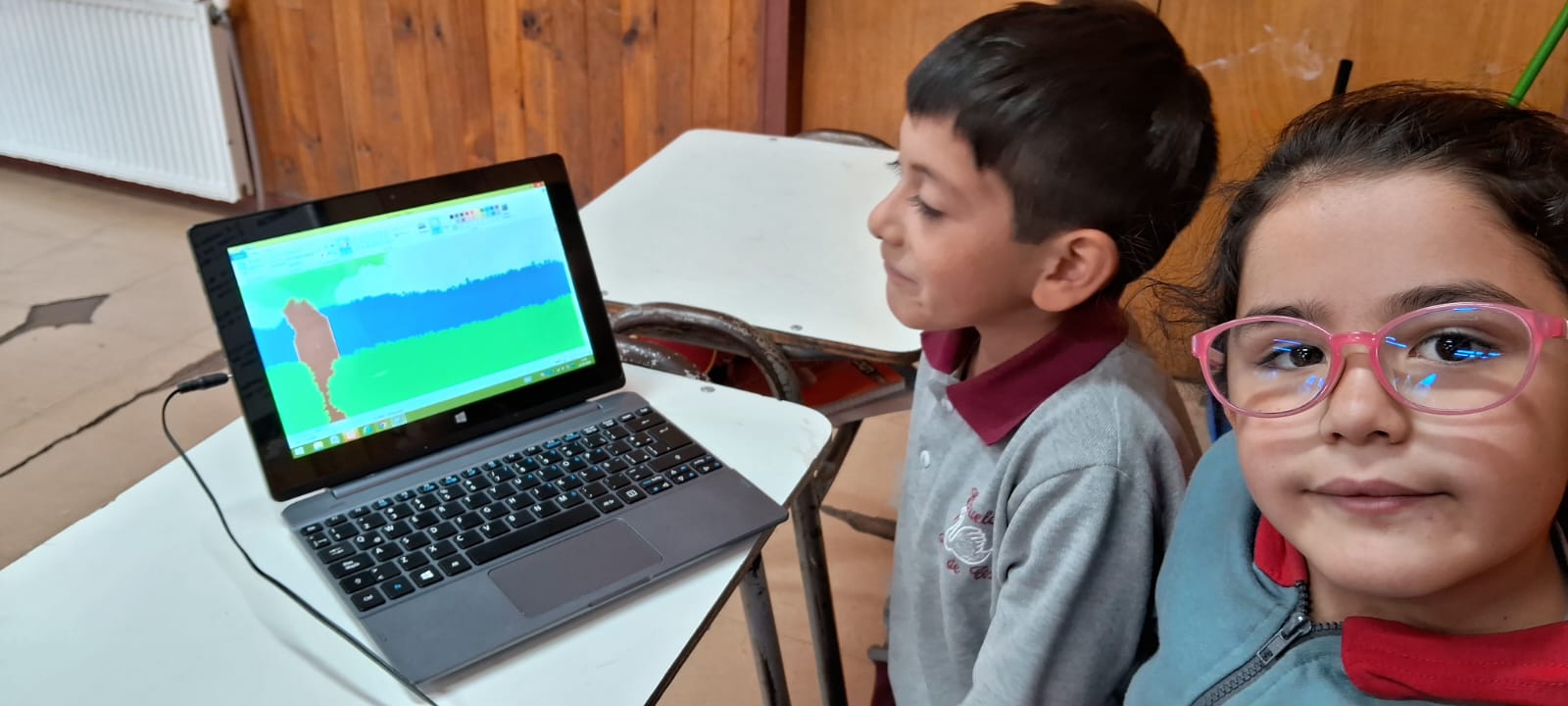 En la Escuela Nido de Cisnes, en el curso 2° básico, con la profesora Gladys Norambuena los niños y niñas trabajaron con computadores en la asignatura de Tecnología. En la unidad “Uso de software tecnológica”, dibujaron paisajes con el fin de aprender herramientas digitales (pincel, carrito de pintura, lupa, etc.) para hacer paisajes de Chile y cruzar con historia.